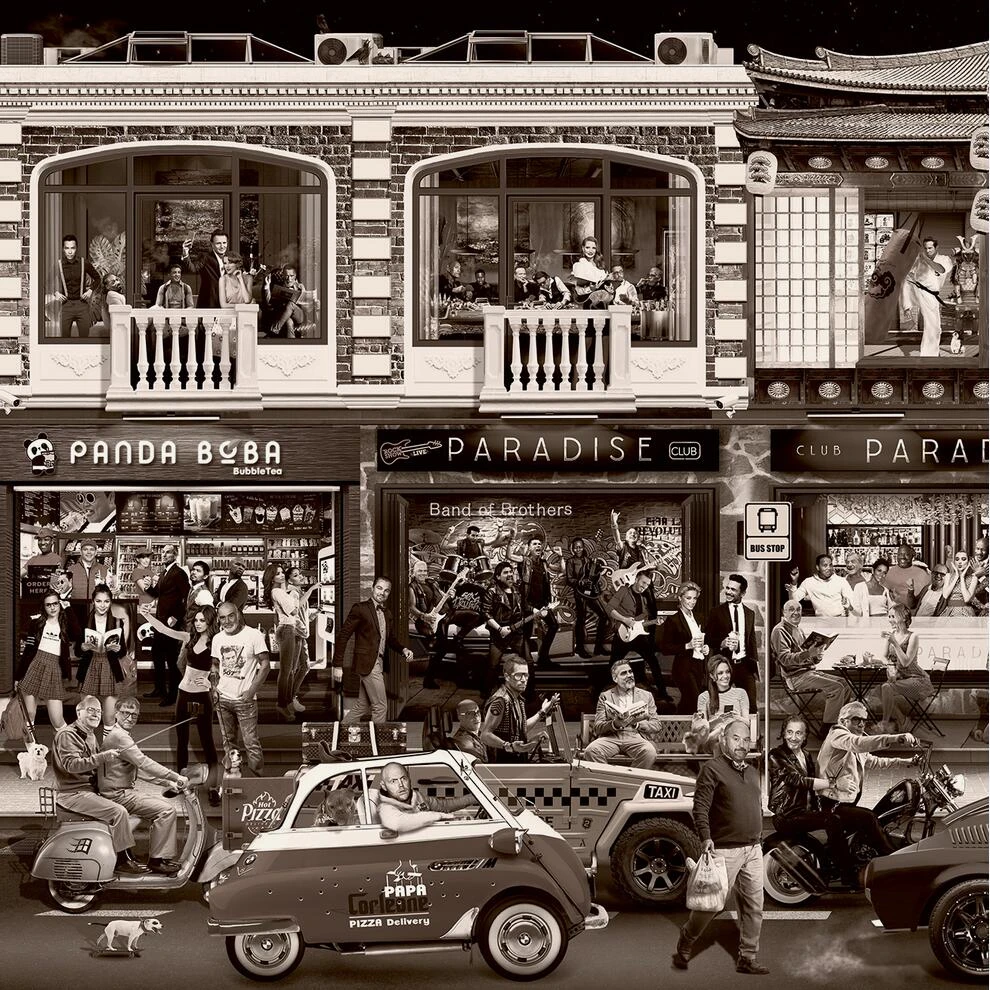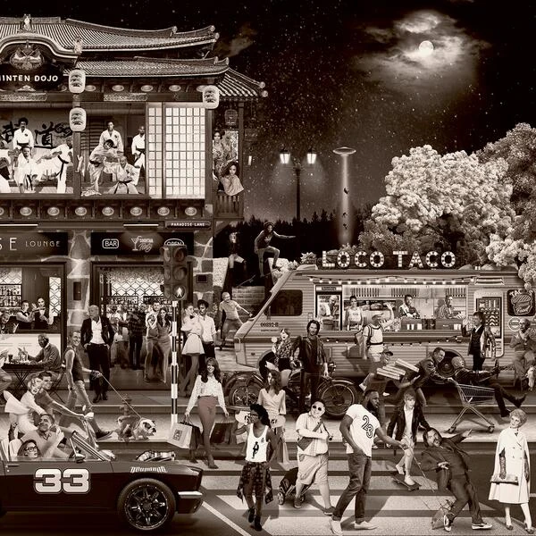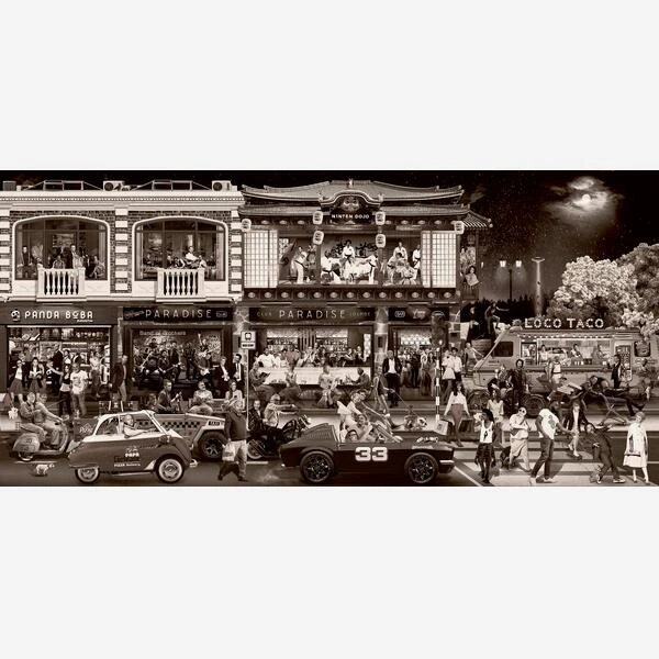 black and white photographic artwork, depicting a bustling roadside