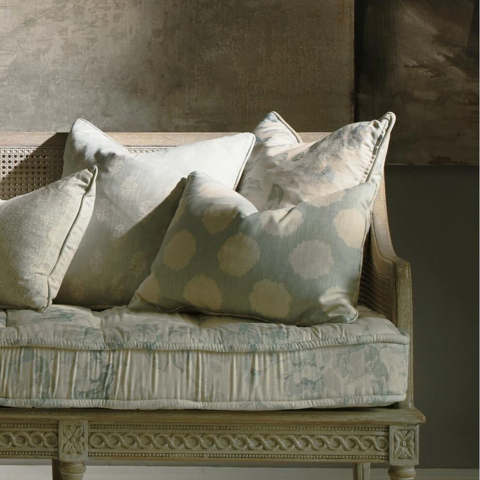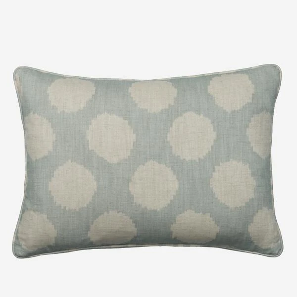 A luxurious cushion made from , a circular ikat spot design, which forms a loose