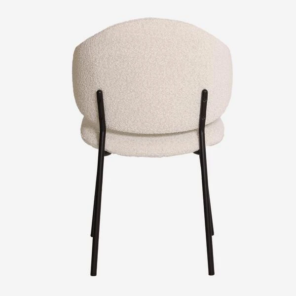 off-white bouclé fabric with smart black metal legs. The slightly