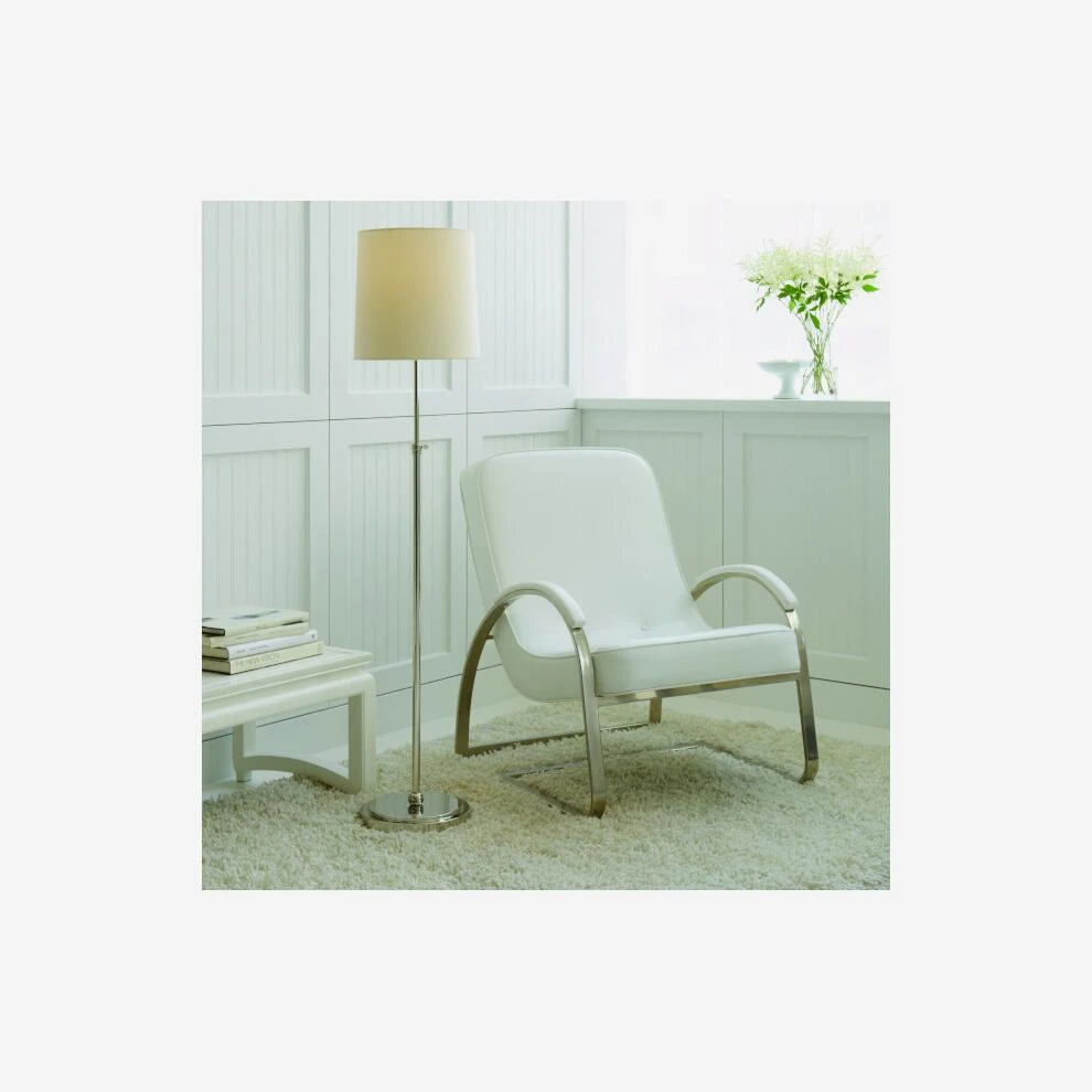 polished nickel with a cream linen shade. Crafted by iconic