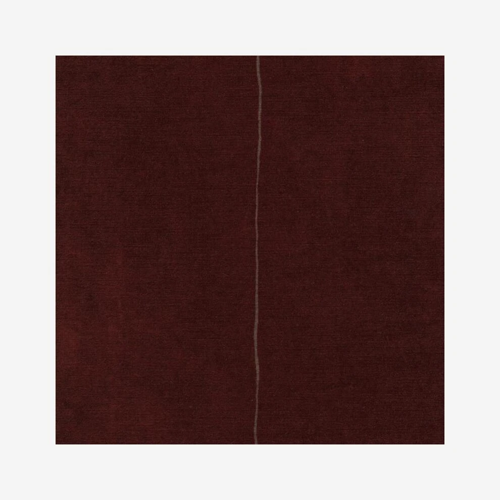 An irregular fine, buff stripe printed onto rich red velvet. For
