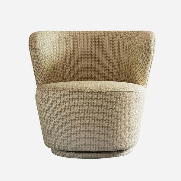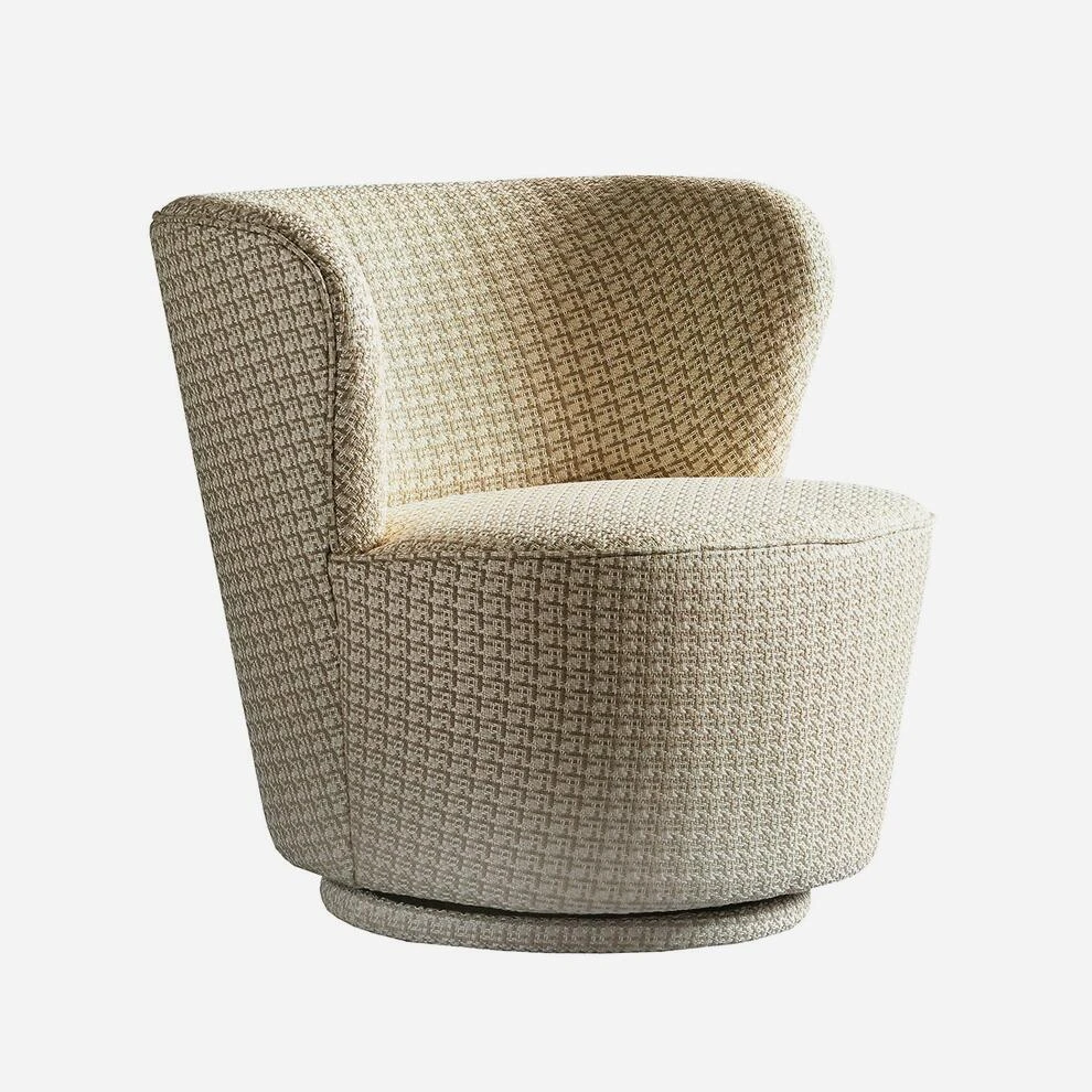 on its swivel base. It is covered in luxurious neutral houndstooth