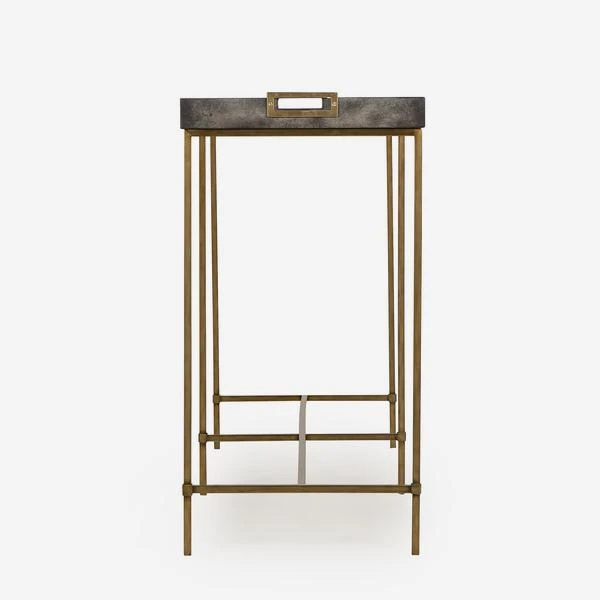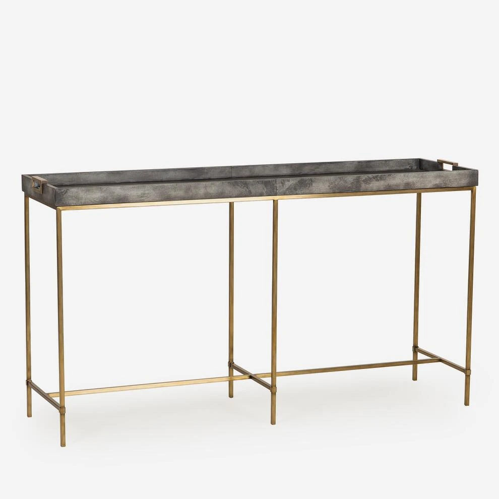 A charcoal tray top console table, with satin brass finish