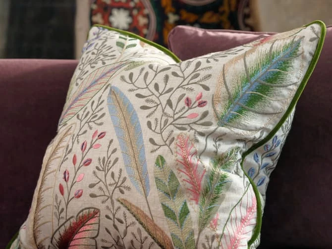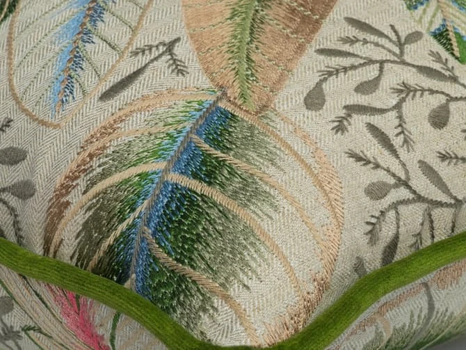 A linen, embroidered cushion made from Spirit, a