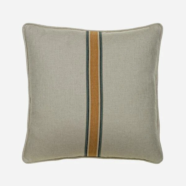 Linen cushion with a gold and teal medal stripe