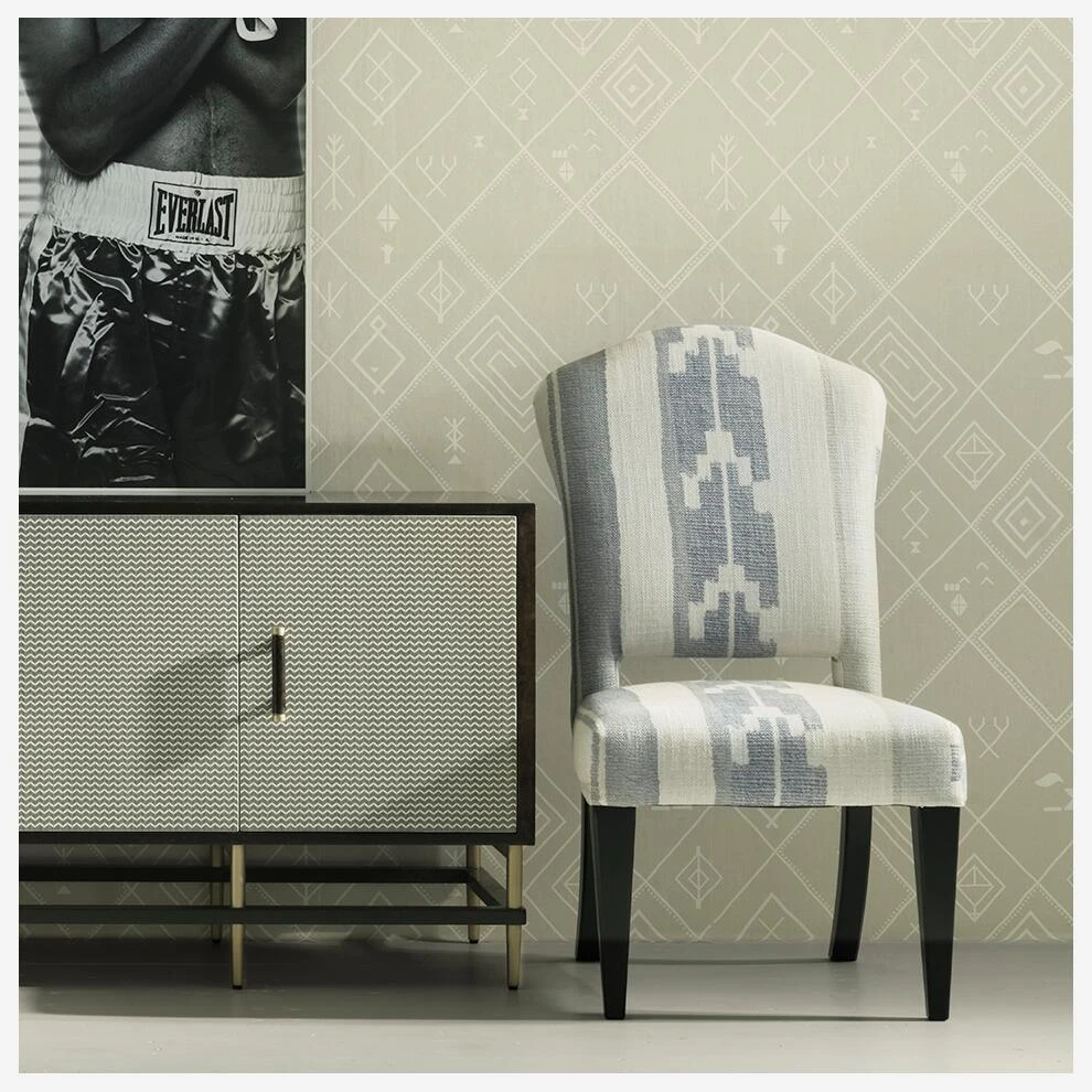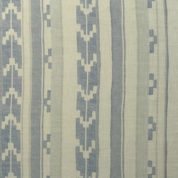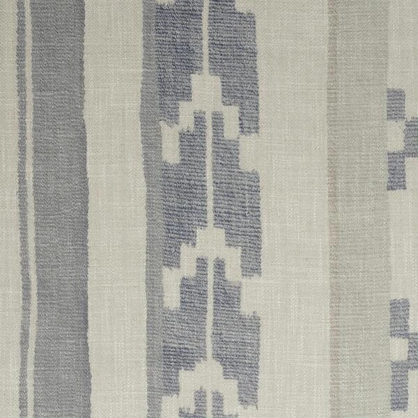 In stony off white and powder blue, the geometric motif and