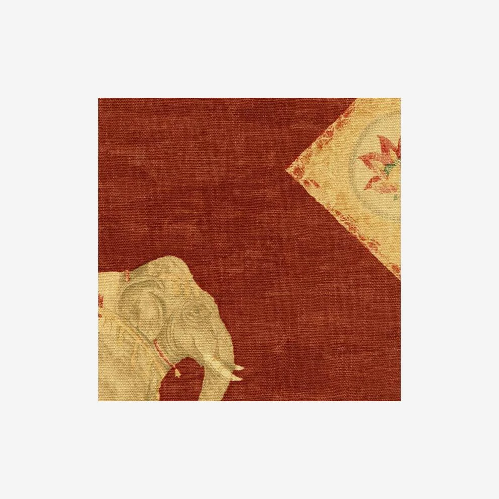 ground in regal red. The sandy elephants stand out of this rustic