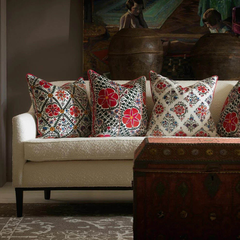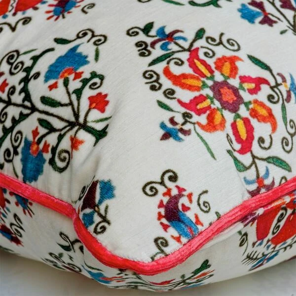A plush velvet cushion featuring our fabric, a printed velvet vintage suzani design inspired