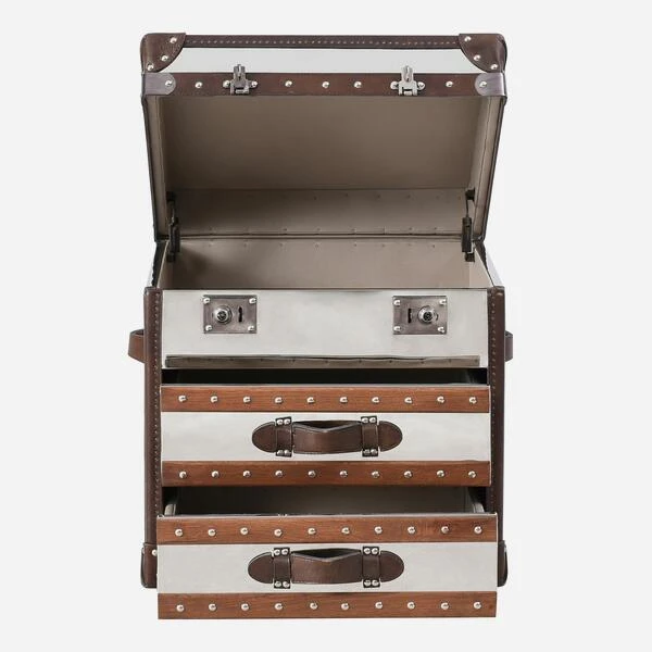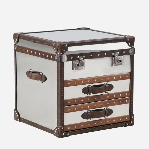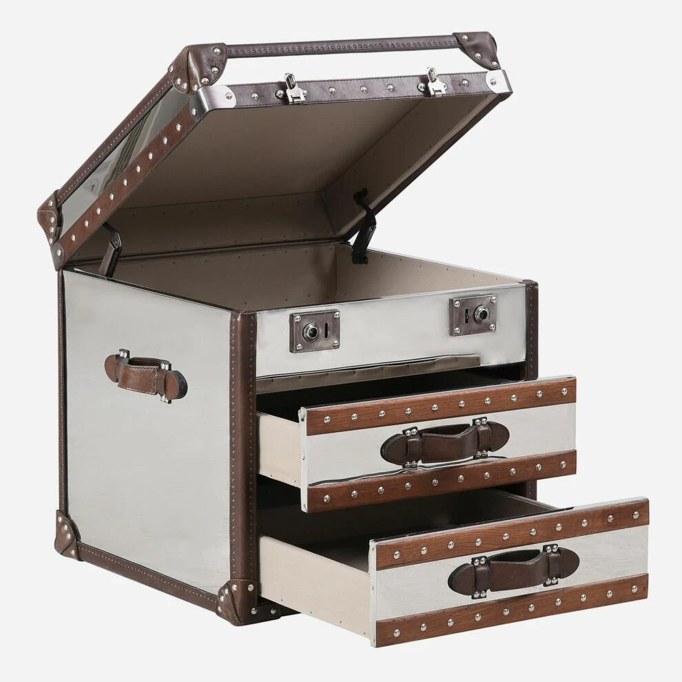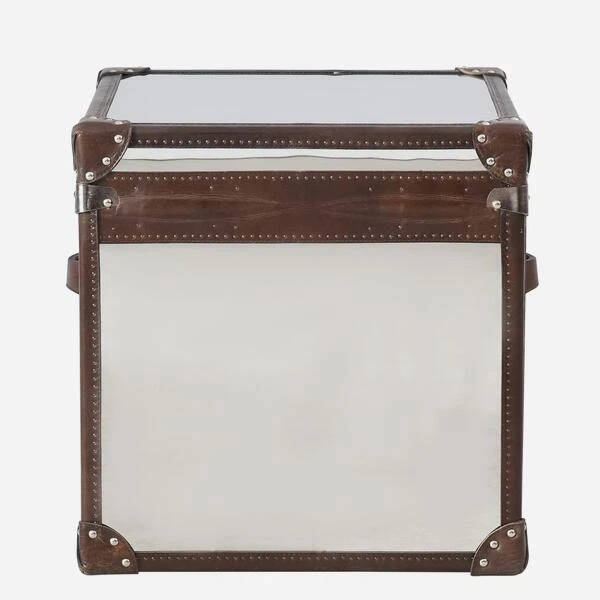 A vintage, square steamer trunk with chrome finish, worn leather