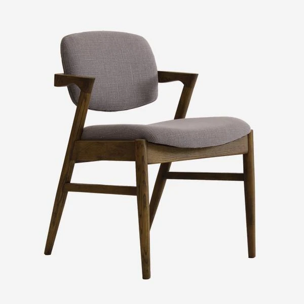 wood frame with a back and seat upholstered in cool, grey coloured