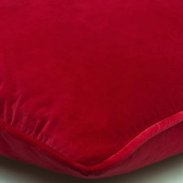 A luxurious, super soft velvet cushion in red made from , a 100% cotton pile velvet woven in the valleys of