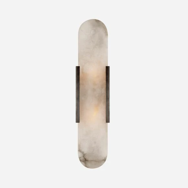 An elongated wall light affixed with bronze and with the light
