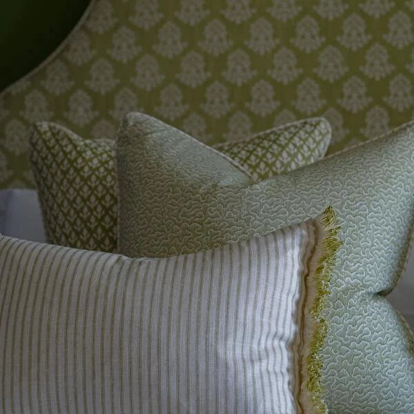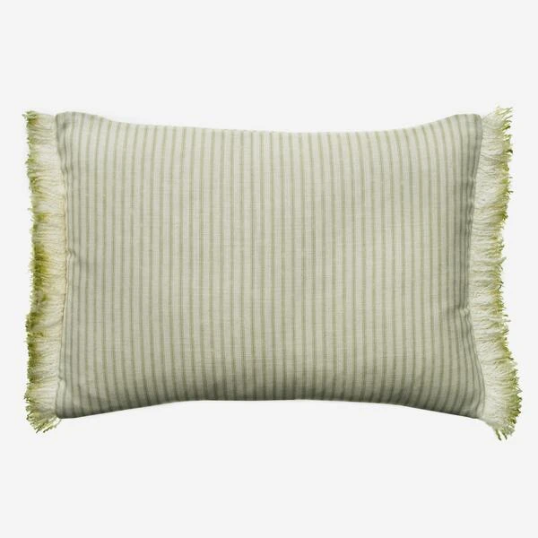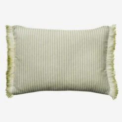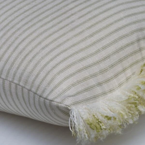 Green ticking stripe cushion with cream fringe