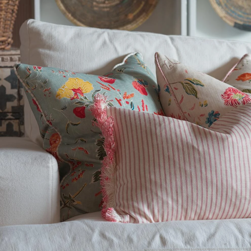 Pink ticking stripe cushion with cream fringe