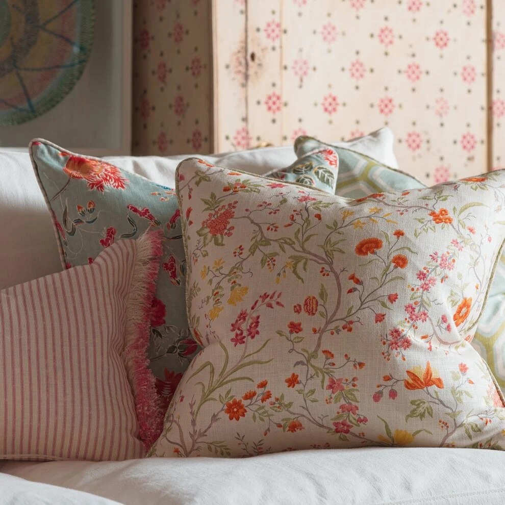 fabric. This cushion features whimsical floral motifs in