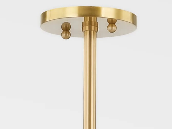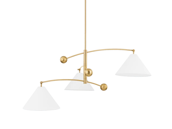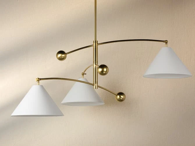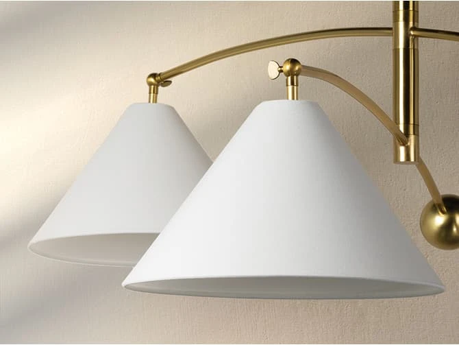 A soft white linen shade on one end balances a solid aged brass