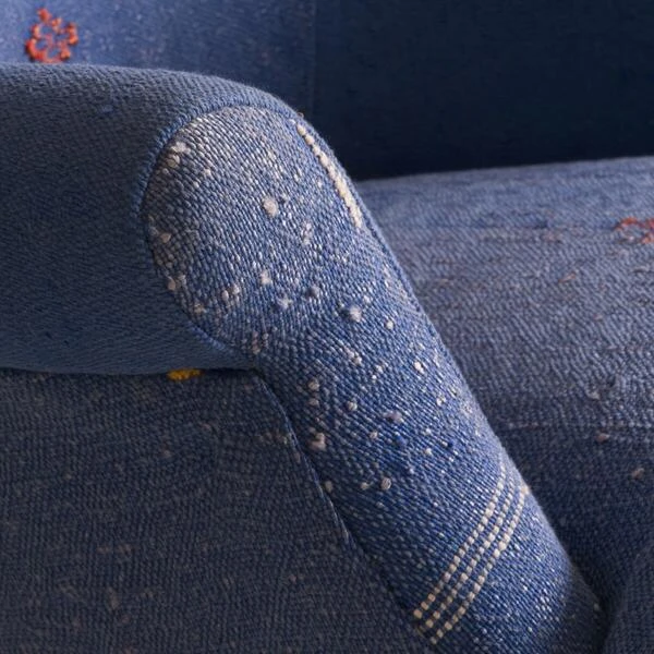 yellow, and blue, the fabric on these armchairs is handwoven by